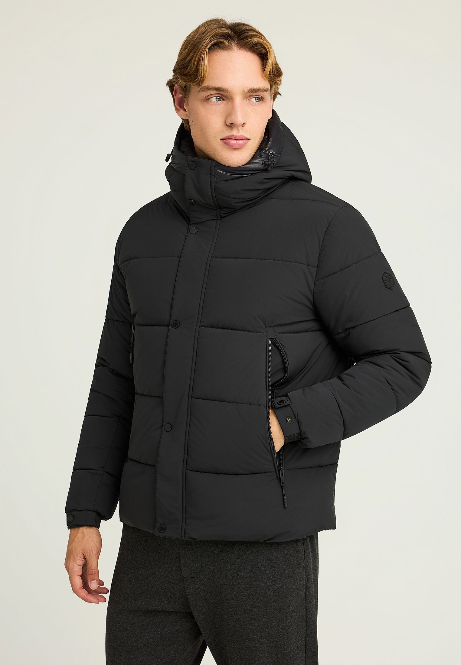 Ανδρικό μονόχρωμο puffer μπουφάν, ιδανικό για τις κρύες ημέρες του φθινοπώρου και του χειμώνα. Με κανονική εφαρμογή και μήκος μέχρι τους γοφούς, προσφέρει άνεση και προστασία, χάρη στον ψηλό λαιμό με κουκούλα και τις ρυθμιζόμενες μανσέτες. Η καπιτονέ υφή του από συνθετικά υφάσματα και πολυεστέρα χαρίζει ζεστασιά και ανθεκτικότητα, ενώ η λεπτομέρεια λογότυπου προσθέτει διακριτικό στυλ. Εξοπλισμένο με τσέπη με φερμουάρ και διπλό κλείσιμο με φερμουάρ και κουμπιά, αποτελεί ιδανική επιλογή για σπορ χιονιού, πεζοπορία και outdoor δραστηριότητες. Συνδυάστε το με casual στρώσεις και ανθεκτικά παπούτσια για μια ολοκληρωμένη εμφάνιση εξωτερικού χώρου.